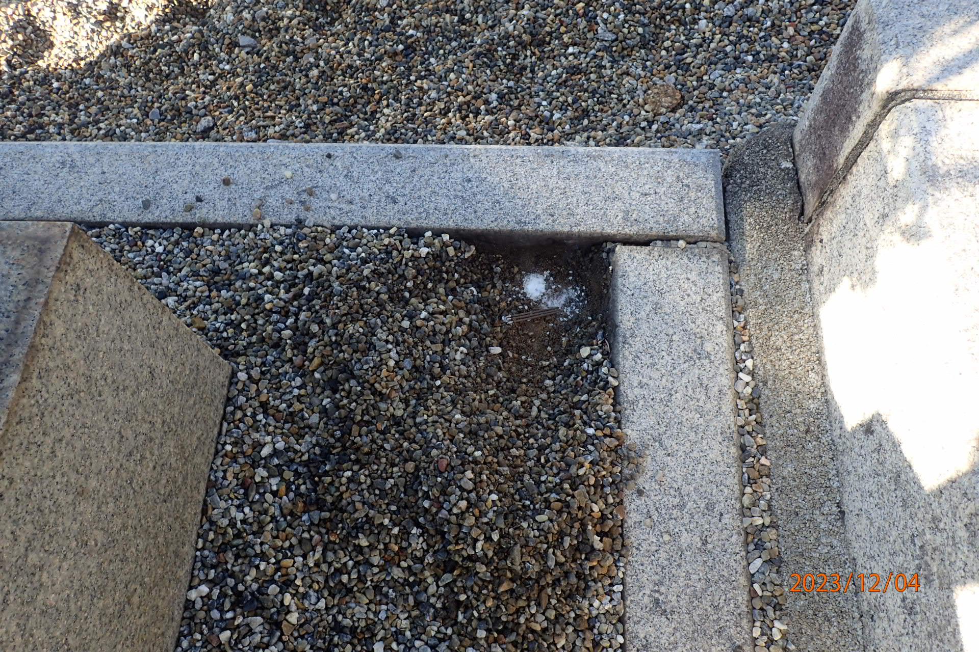 完成した状態では水鉢の裏に隠れることになりますが、いざ納骨という際に水鉢をどかしますとこの納骨穴が見え、そこからお骨をお墓の下にお納めすることができるという仕組みです。