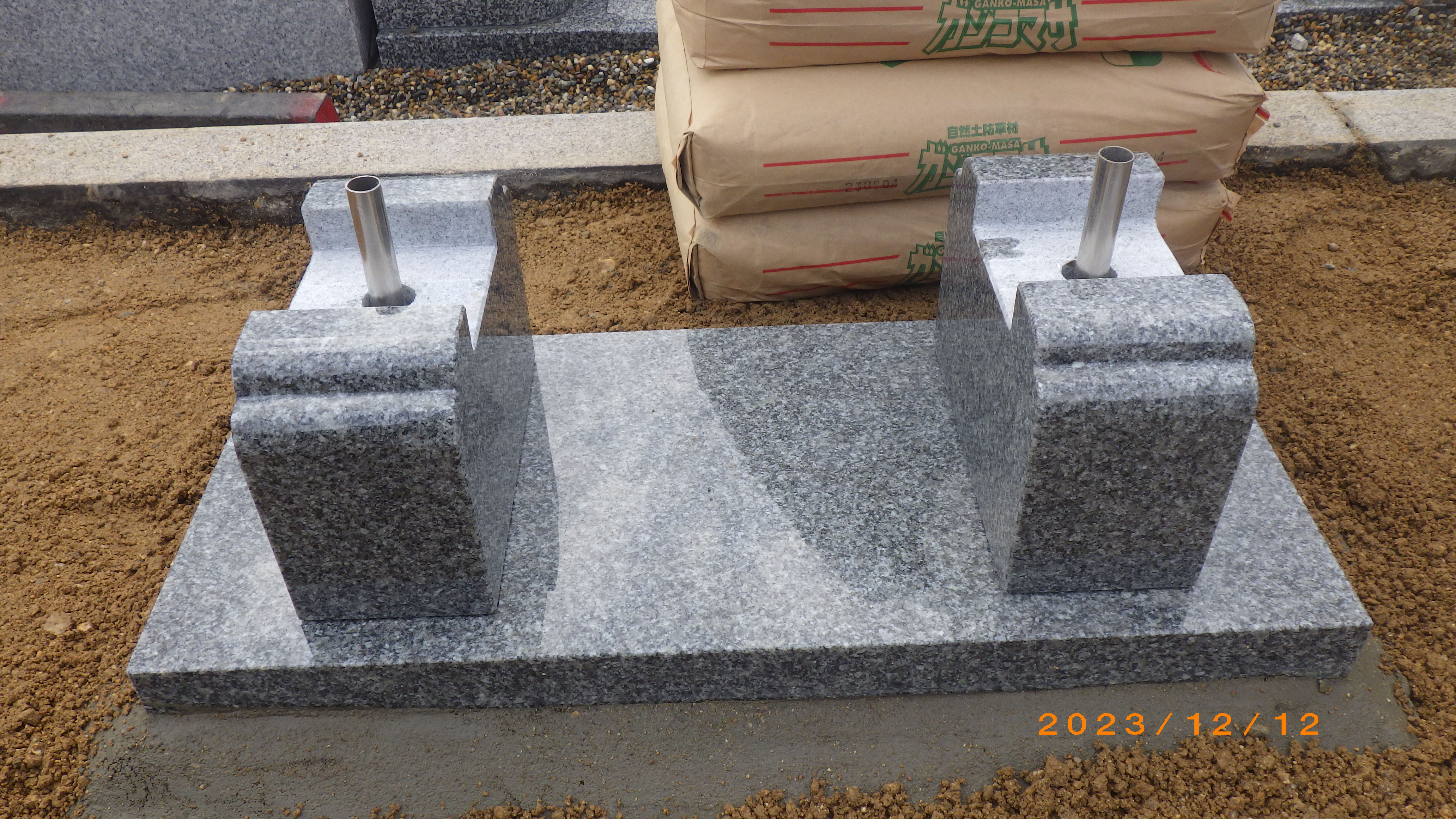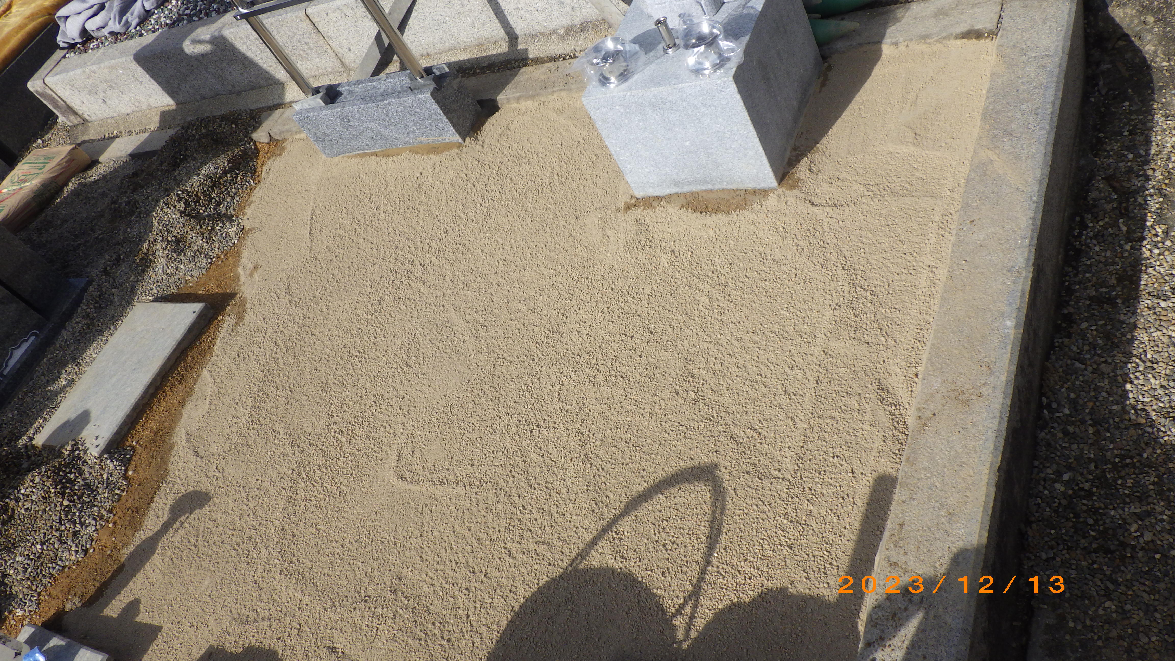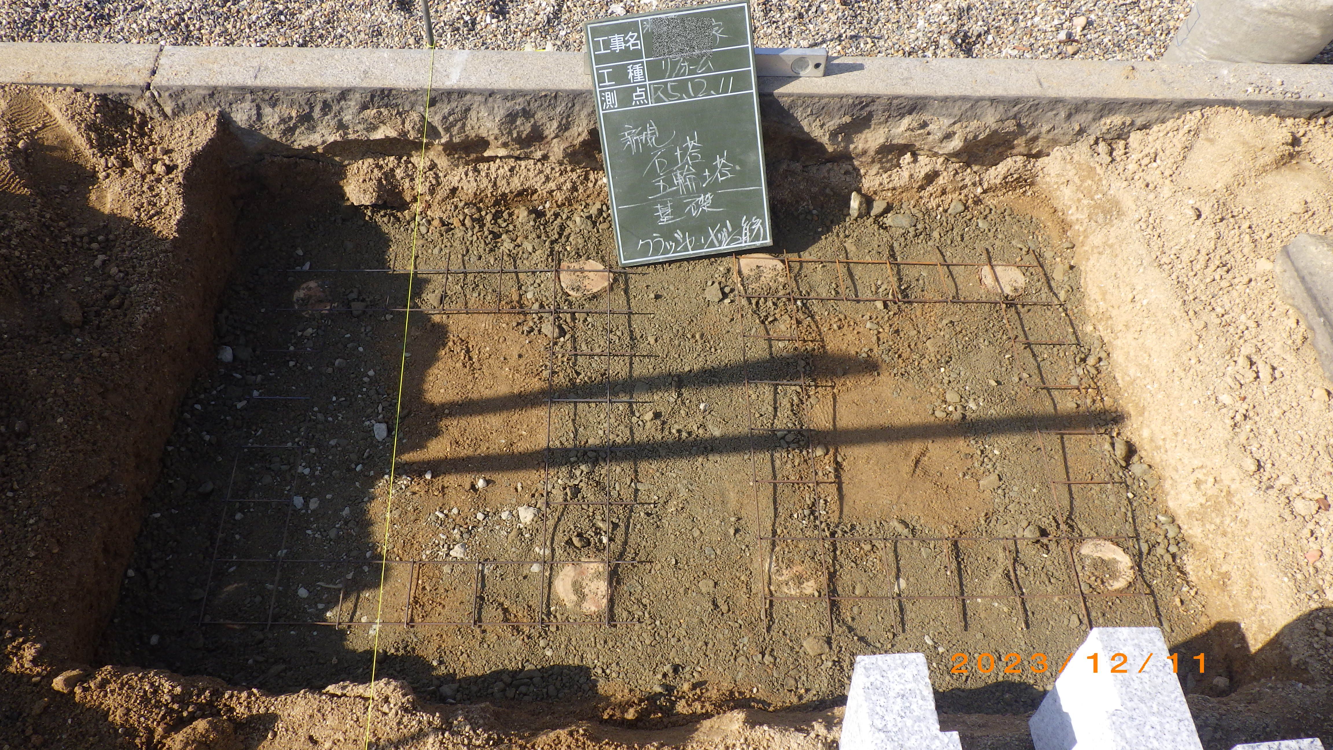 さらにその上にクラッシャー(砕石)を敷き、メッシュ筋を施工しまして、その上に御影石の石棺をセメントで固定します。