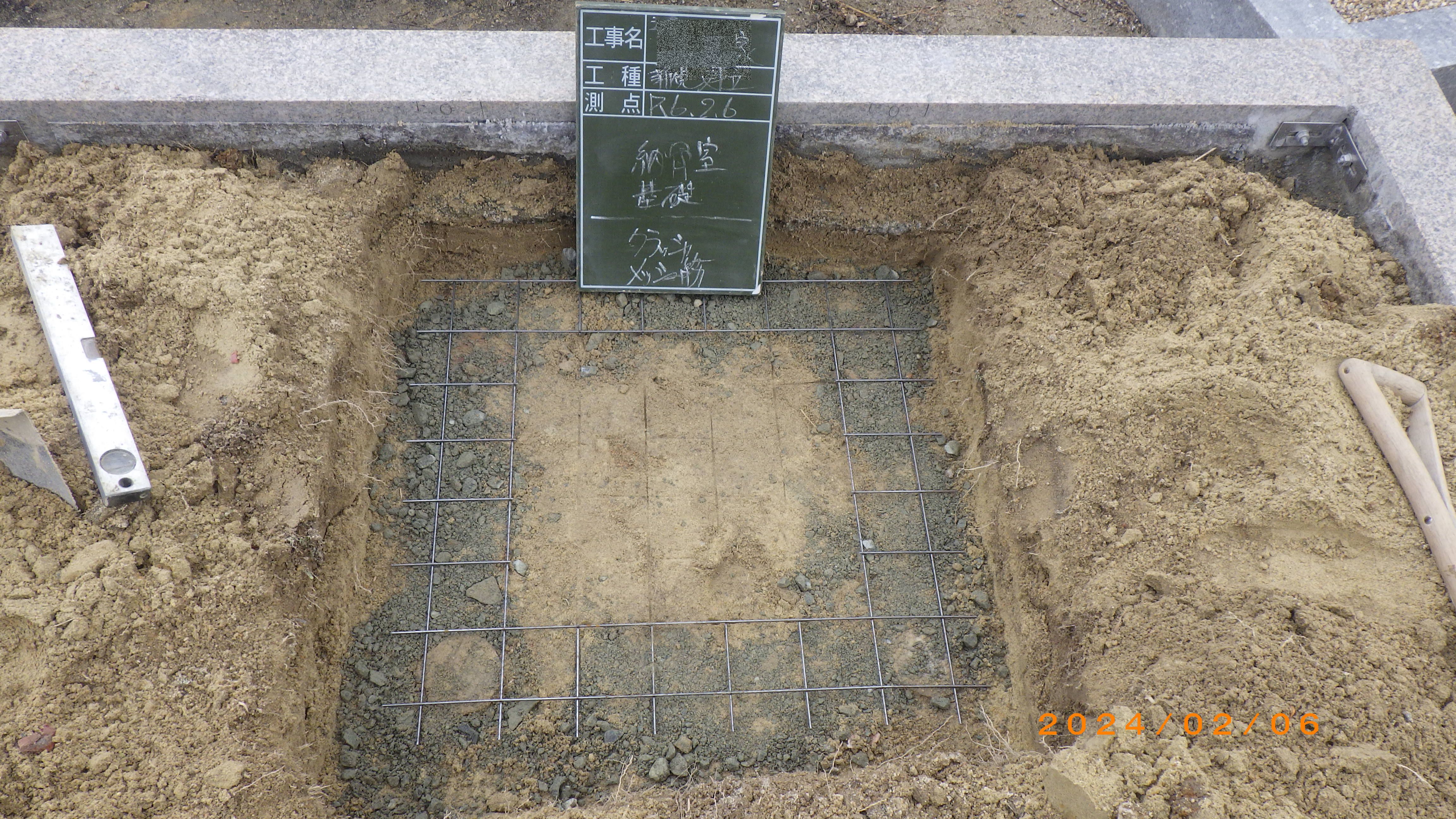 さらにその上にクラッシャー(砕石)を敷いてメッシュ筋を施工し、白御影石の石棺をセメントで固定します。