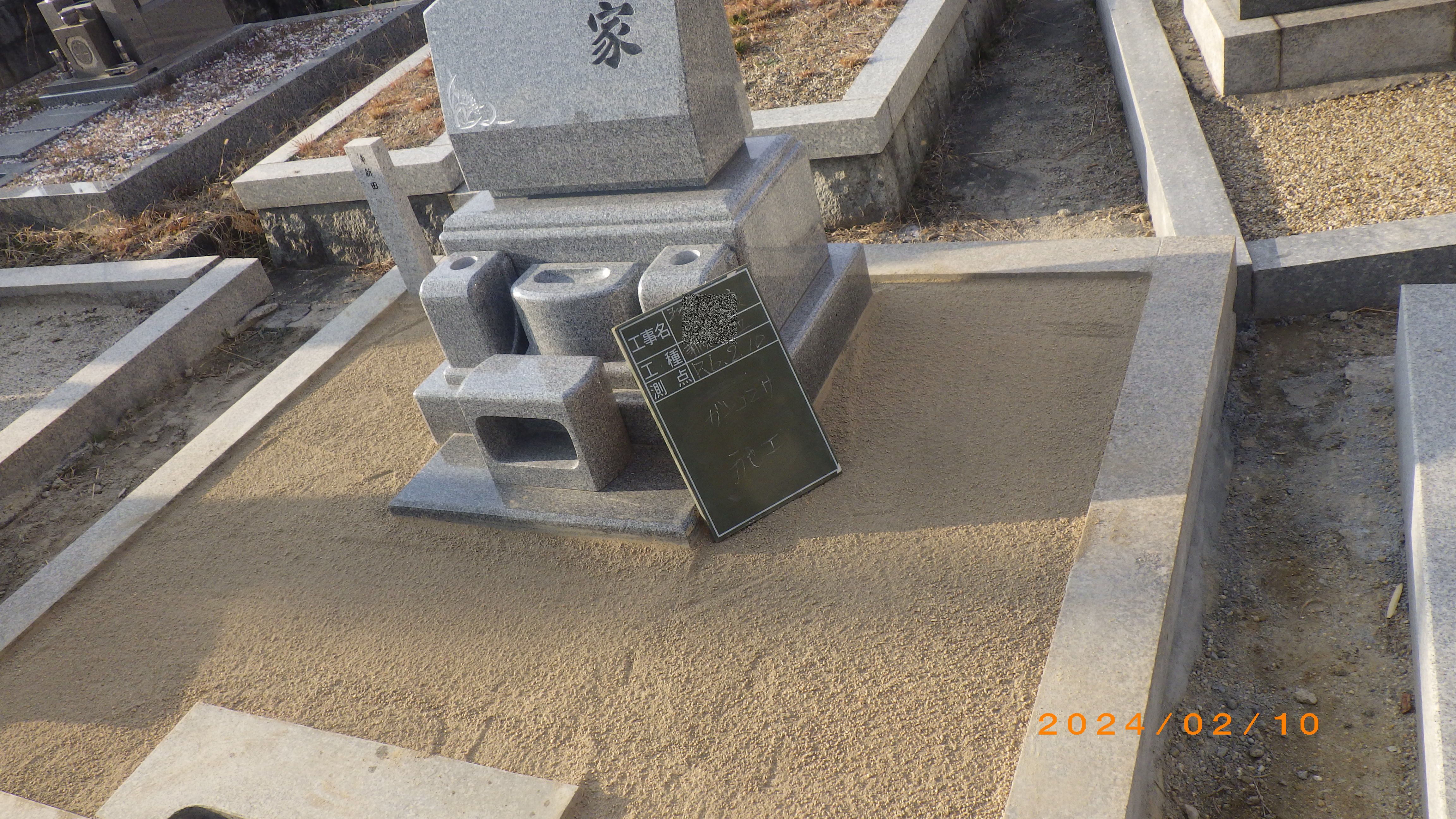 石塔本体の前に香炉、水鉢、花立等を設置し、先ほど土を入れた区画内は、普通の土の上に草の生えにくい土を施工します。