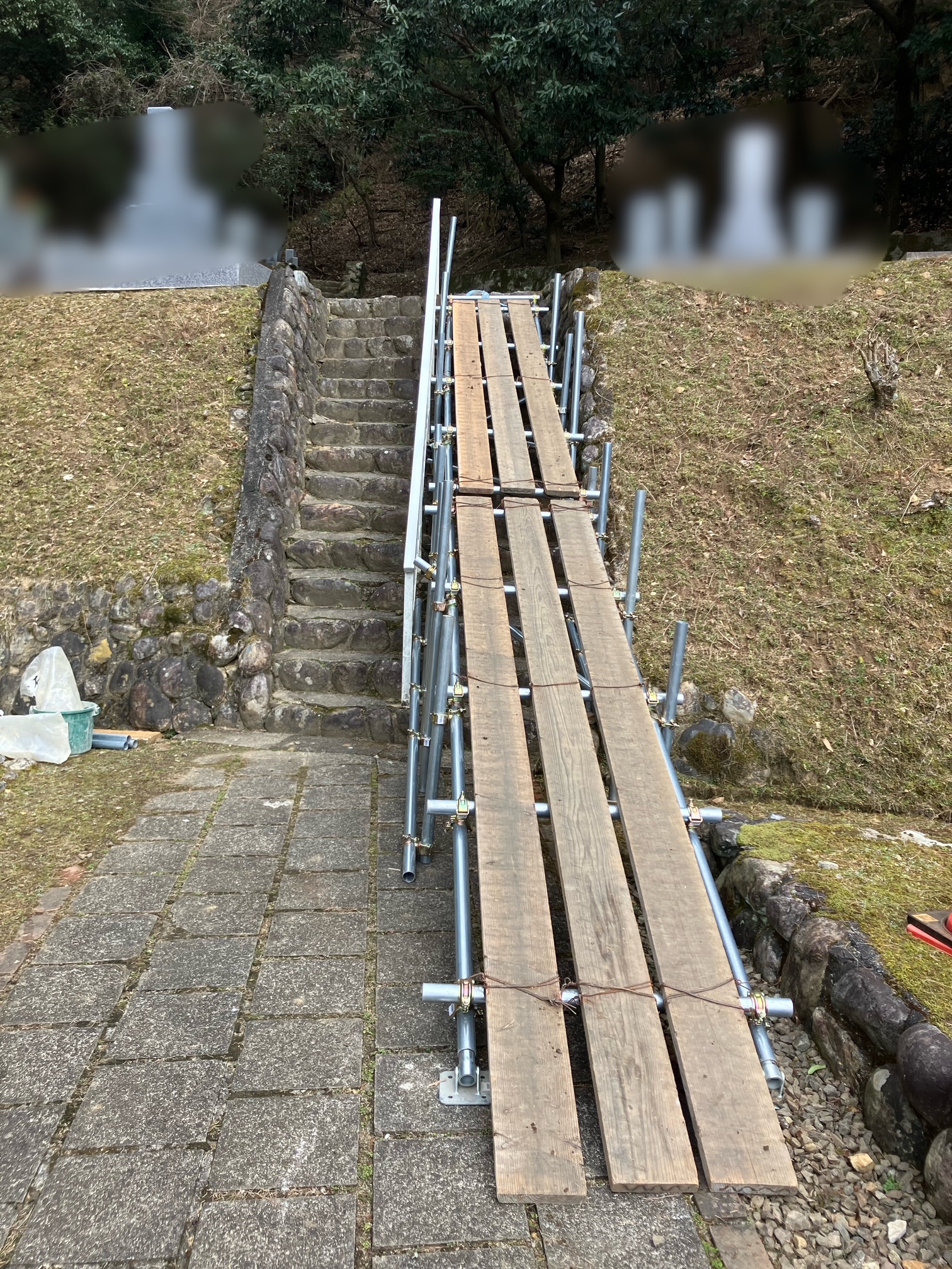 正直、市営墓地という公共施設でありながら、これだけ急な階段はどうなのか、と思わないではないのですが、これが作業条件である以上は立ち向かうしかないわけですね。
