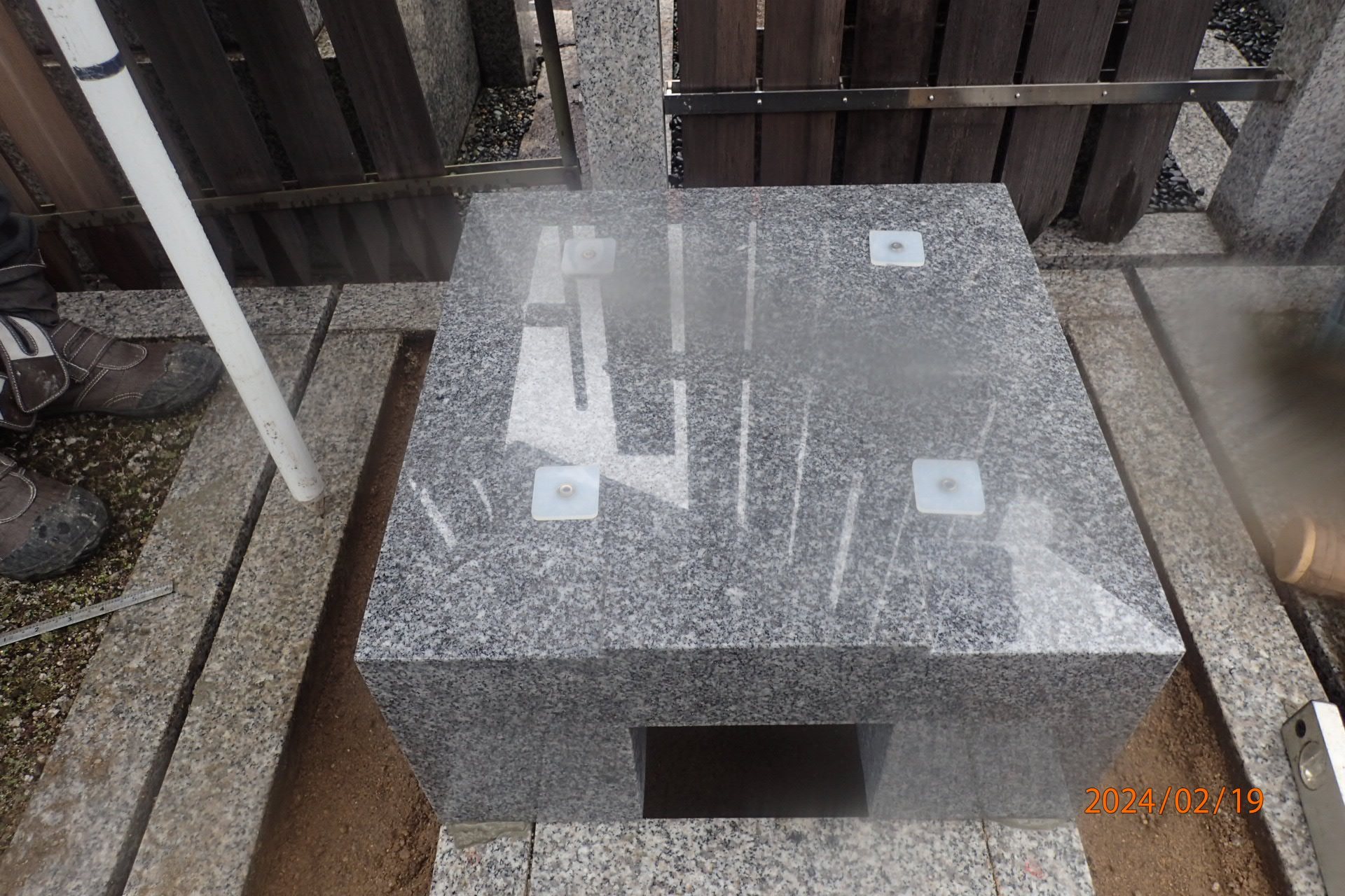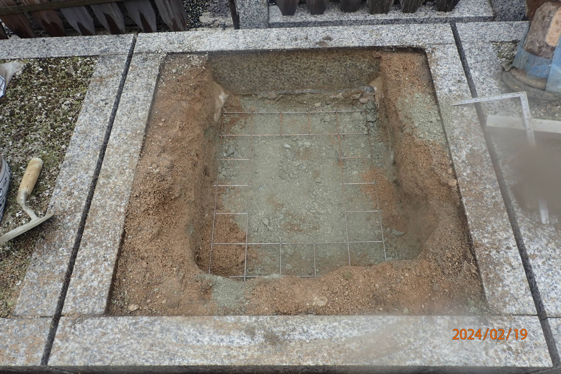 区画の中央に穴を掘り、クラッシャー(砕石)とメッシュ筋を施工しまして、その上に御影石の納骨室を据えます。