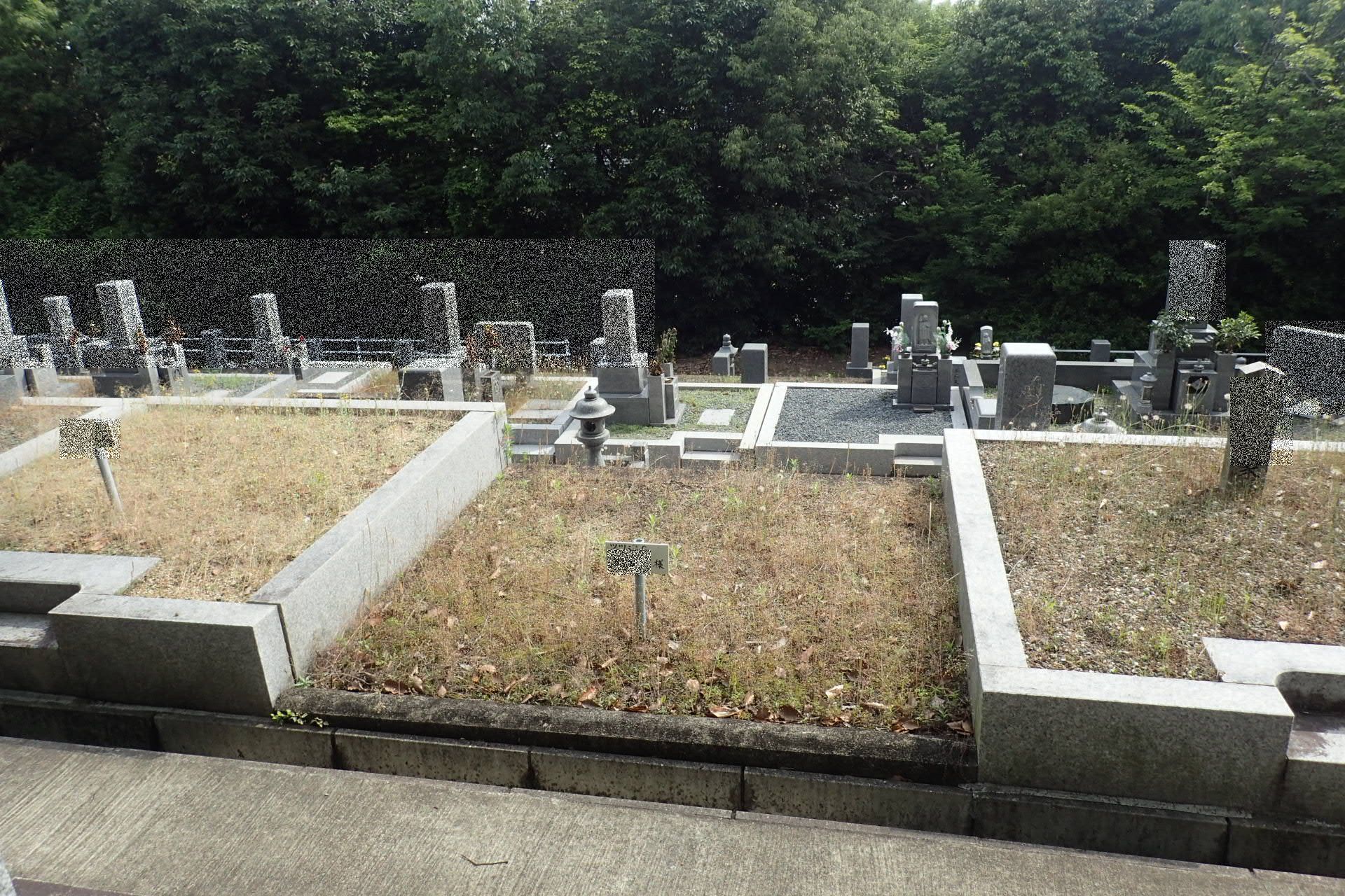両隣の区画なども石塔が立っていませんが、写真中央は巻石もないまったくの更地の墓所です。