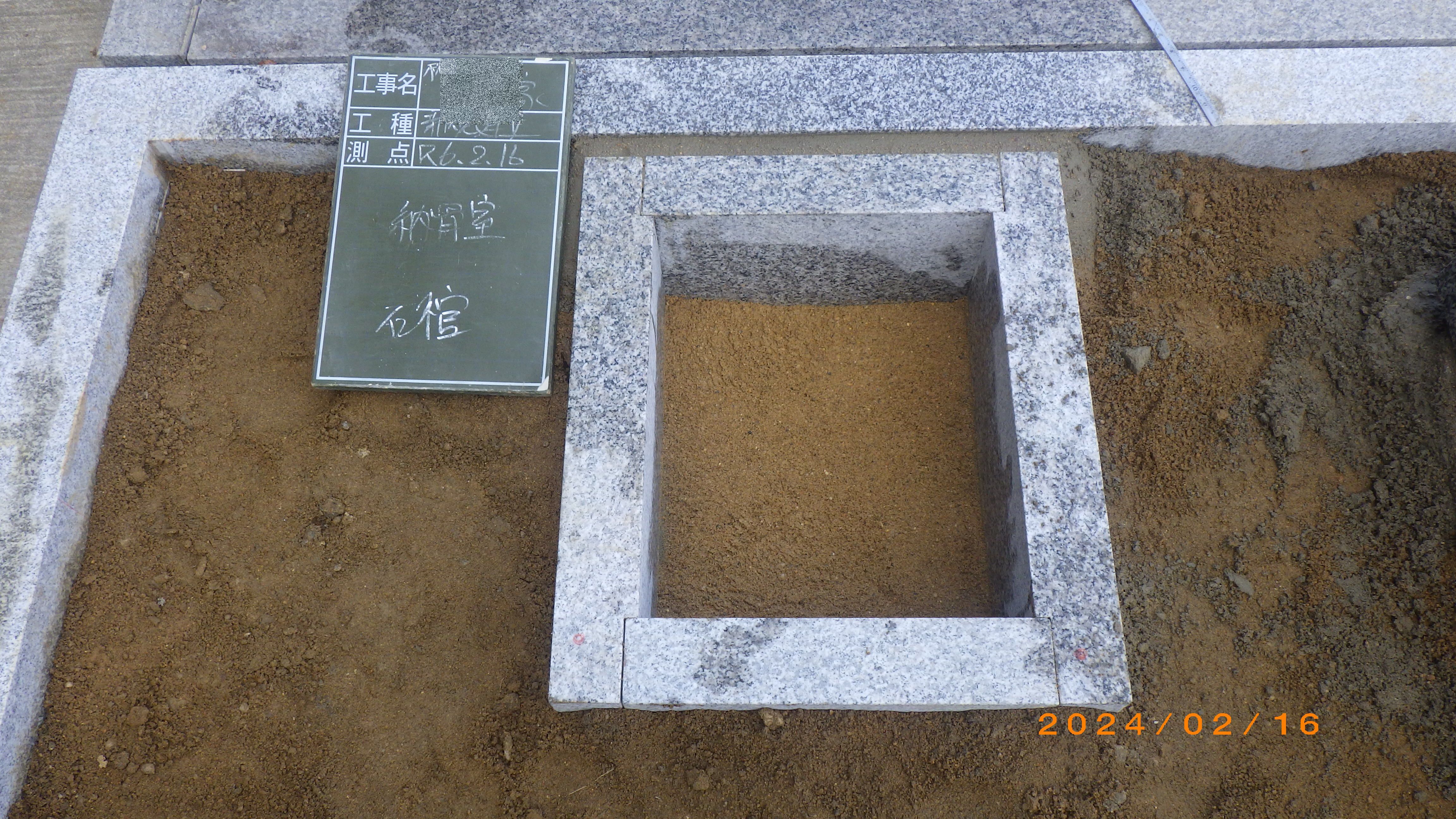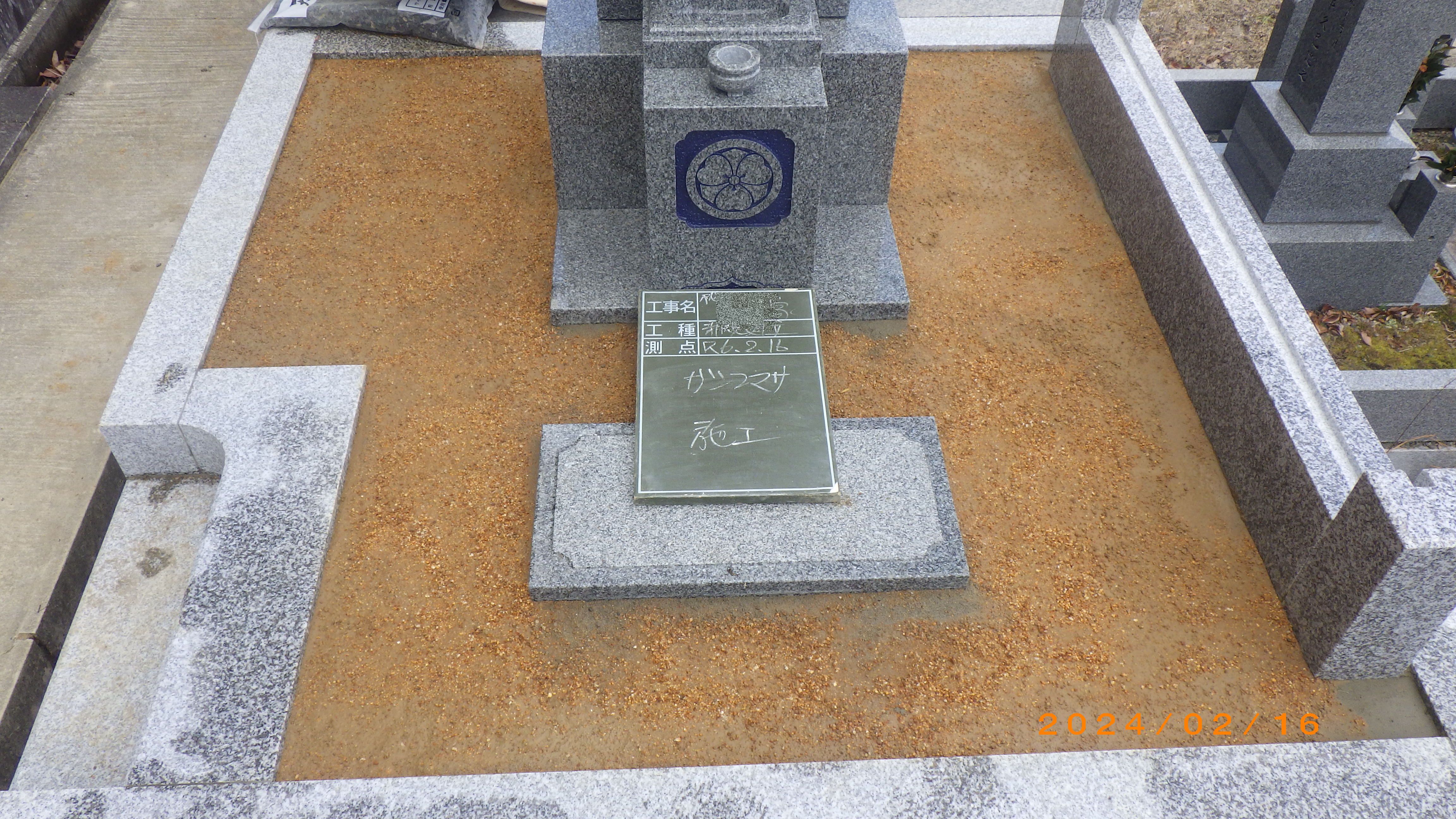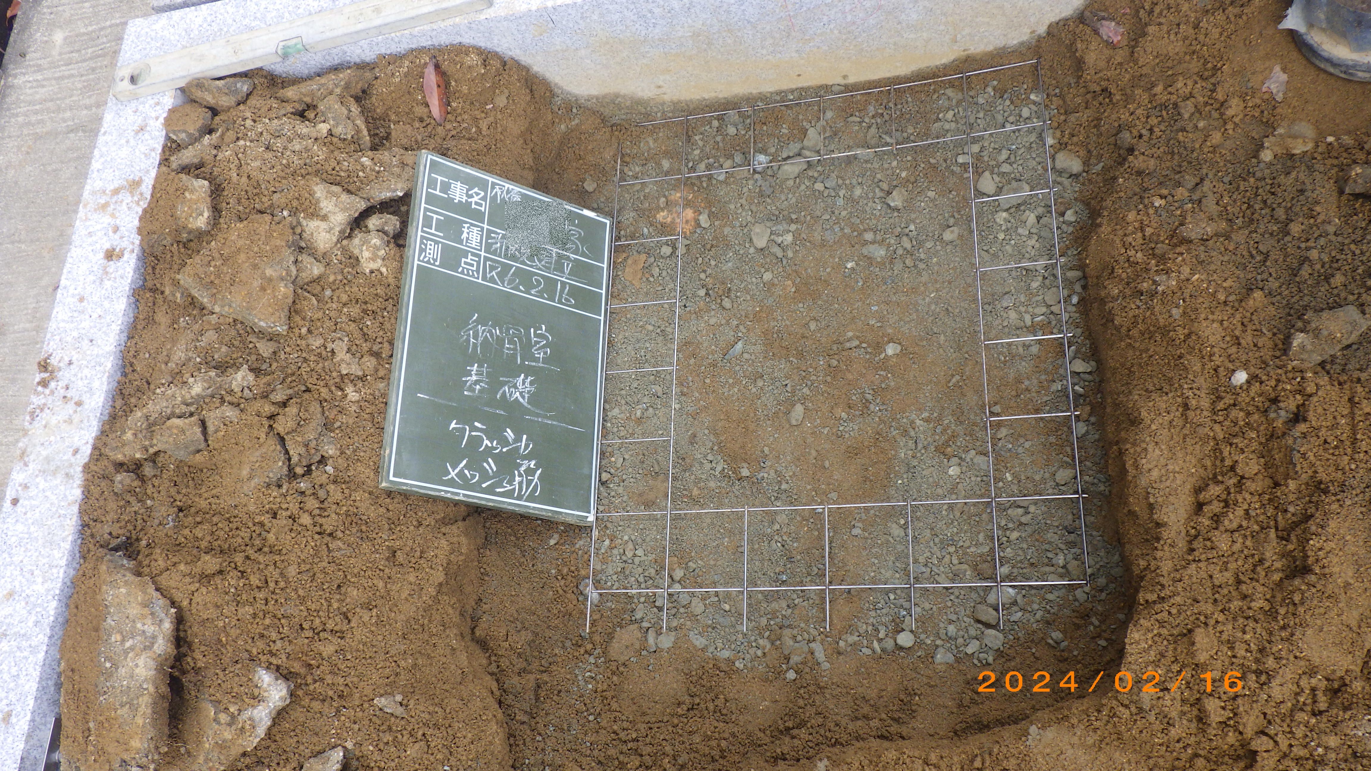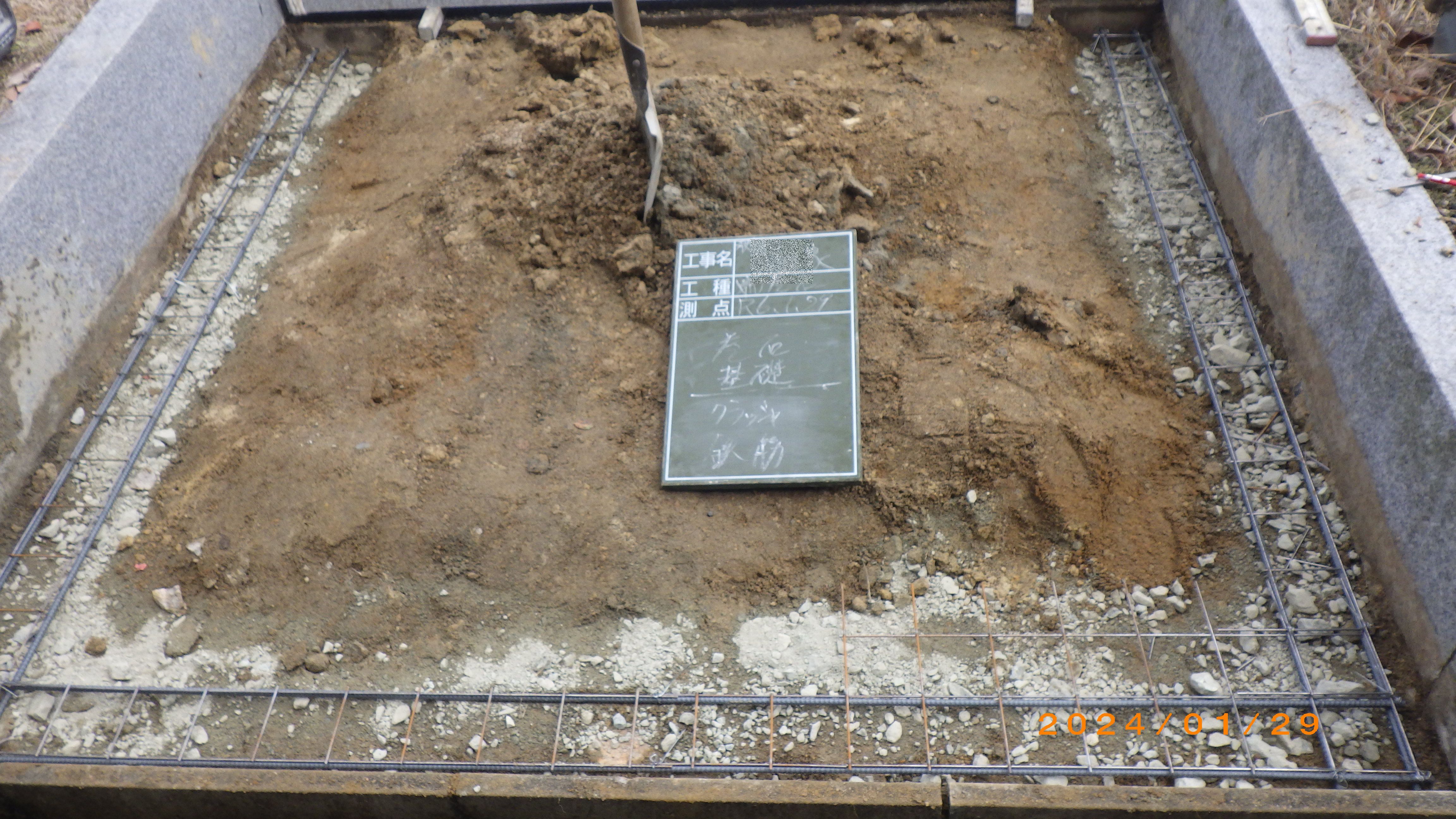 その上にクラッシャー(砕石)を敷いてメッシュ筋を施工し、さらにその上に納骨室の部材である御影石をセメントで固定していく、という流れになります。