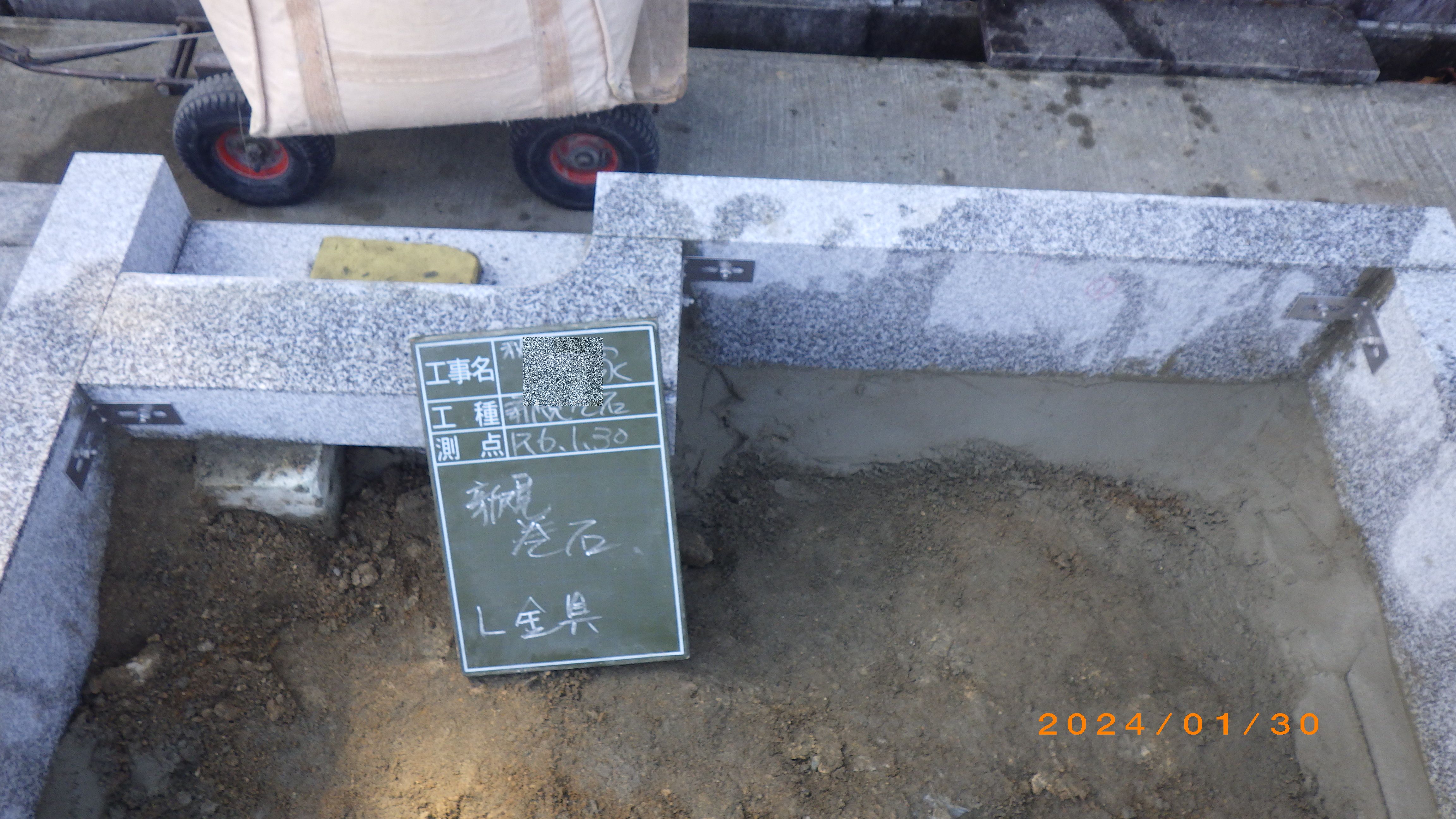 次はいよいよ石塔の工事に入っていくわけですが、いきなり石塔本体の部材を据え付けたりするわけではありません。