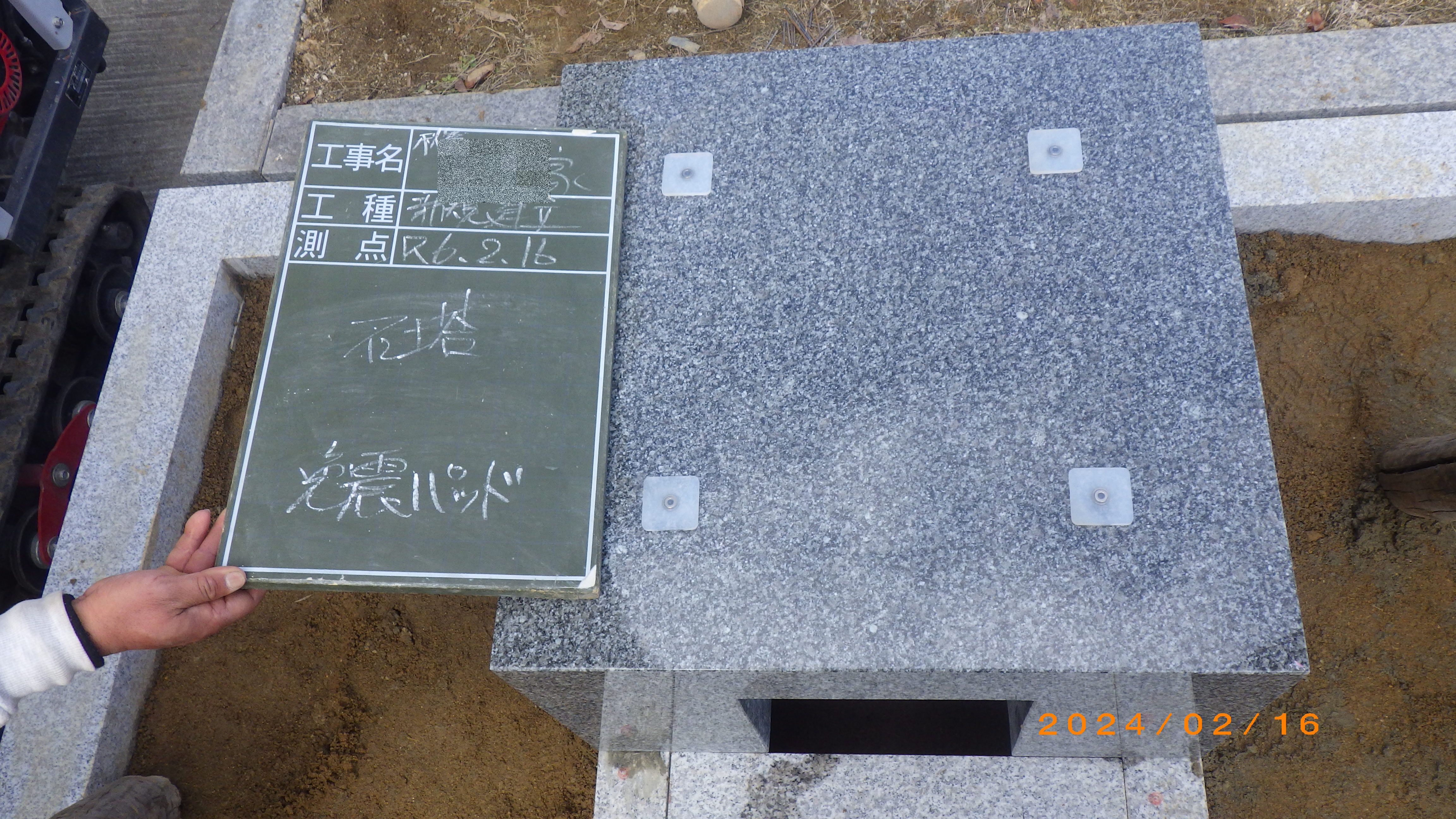 天端に乗っている四つの白いものは、お墓用の免震パッドです。