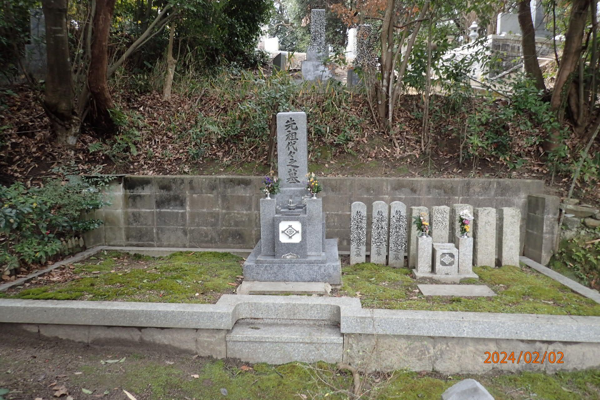 非常に広い敷地の中心に芝台付の石塔が立ち、向かって右側に代々のご先祖様の名前を刻んだ小石塔が立ち並ぶという、立派な墓所です。
