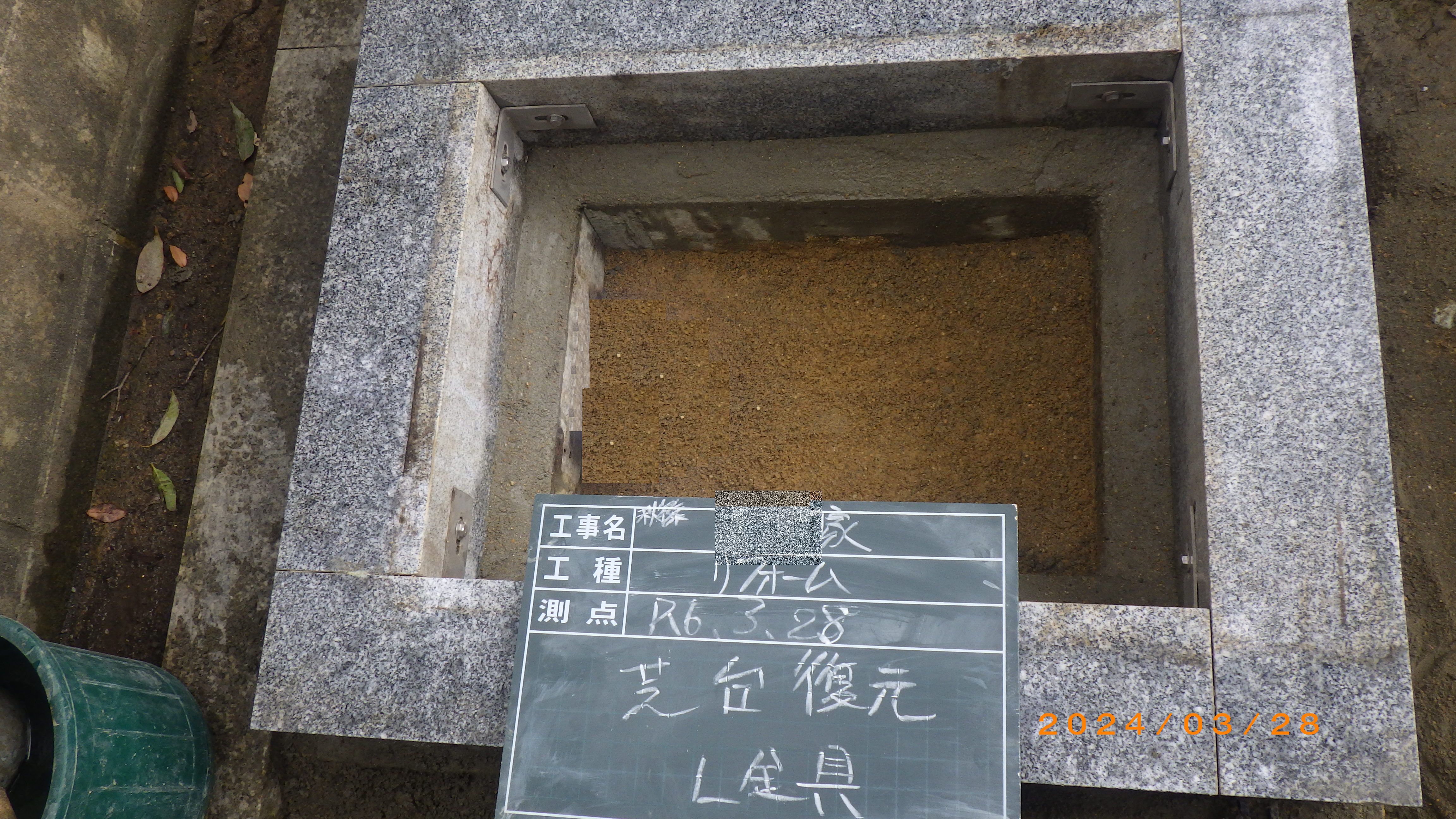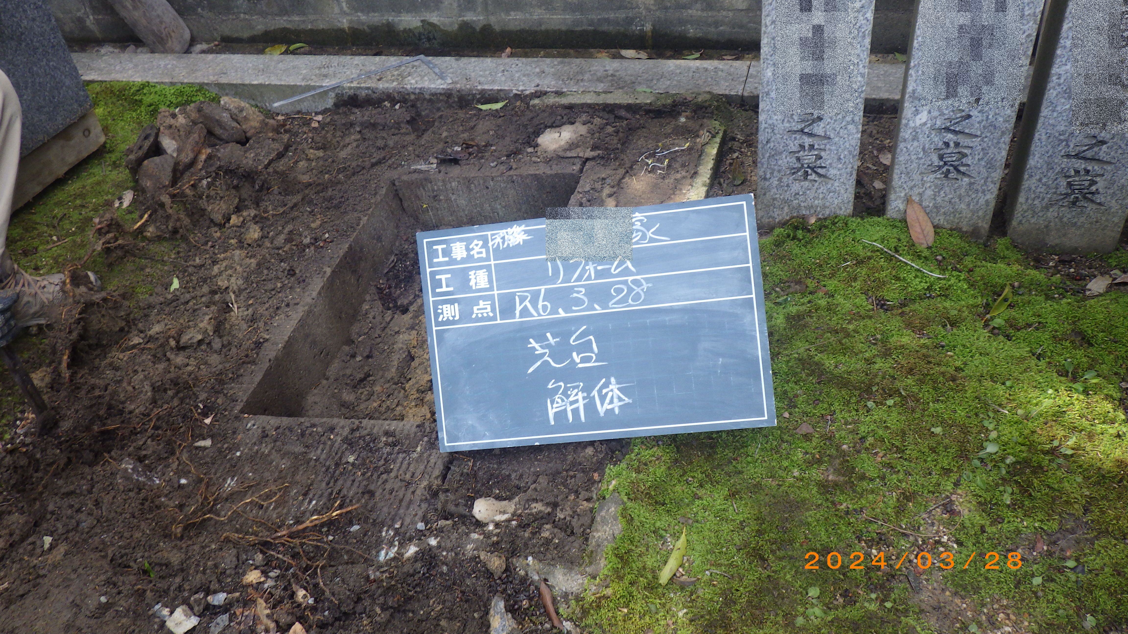 写真は、石塔および芝台の解体を済ませた、というところです。